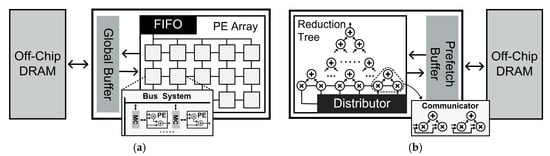 In a reduction-tree based accelerator, data distribution logic blocks (Communicator and Distributor) are utilized for data reuse. To reduce the data movement from DRAM, this architecture typically stores reused data to a prefetch buffer (Prefetch Buffer) and distributes it to a reduction tree (Reduction Tree) using distribution logic circuits, as shown in Figure 2b. The reduction tree has a fixed data flow that performs multiplications in parallel and accumulates the results of the multiplications into an accumulator. In a fixed flow, data reuse is employed using a communicator logic circuit (Communicator) that allows data reuse between multipliers, as shown in Figure 2b. Implementations in [,] employed a logic block for data sharing between multipliers to enable flexible data sharing, but heavy power consumption and silicon area were observed.