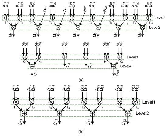In the case of Strassen’s multiplication of two 2 × 2 matrices, the computation step required to obtain each element of the result matrix is different whereas the arithmetic steps to compute each element in naïve multiplication are uniform []. For instance, as shown in Figure 3a and Figure 4a, in the multiplication of two 2 × 2 matrices to get C11, C12, C21 and C22, computing C11 requires four arithmetic steps, whereas computing C12 requires three steps. However, as shown in Figure 3b and Figure 4b, in naïve multiplication, each result requires the same four arithmetic steps. The more the arithmetic steps, the more memory they require, which leads to additional power consumption. Furthermore, the larger the matrix size, the more irregular the arithmetic steps become. For example, to calculate a 4 × 4 Strassen’s multiplication, the total number of arithmetic steps is eight, and it requires six to eight steps depending on elements in the final product matrix. In contrast, the naïve multiplication requires only the same three steps for every element in the final result. This means that, as the size of the matrix increases, Strassen’s multiplication requires more memory than naïve multiplication, and the steps involved in computing the result shall become more irregular. The performance and the hardware cost of a pipelined implementation are approximately determined by how appropriately pipeline stages are divided [,]. In addition, if the delay in each pipeline is uneven, such irregularity causes a significant complexity increase and energy inefficiency []. Thus, it is not straightforward to determine the pipeline stages and the balanced delay of each pipeline stage because of the irregular arithmetic steps.
