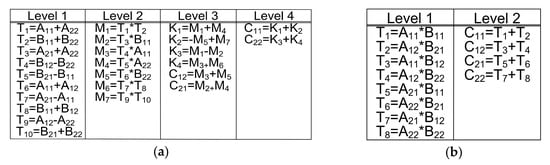 Computational steps of a 2 × 2 matrix multiplication: (a) Strassen; (b) Naïve.