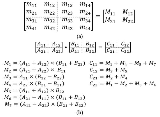 Proposed 4 × 4 matrix multiplication method: (a) Partitioning of a 4 × 4 matrix into a 2 × 2 sub-matrices; (b) proposed matrix multiplication: Naïve (×) and Strassen (•).