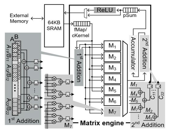 Figure 6 shows the hardware structure of CENNA. CENNA consists of a memory block (64 KB static random-access memory, SRAM) and the proposed matrix multiplier (Matrix Engine). The memory block stores convolution kernels and feature maps. Data from the external DRAM are stored in the memory block and are sent to Matrix Engine. The Matrix Engine consists of components for the proposed matrix multiplication (1st Addition, M1–M7, 2nd Addition) and those for convolution operations (fMap, cKernel, Accumulator, ReLU, and pSum).