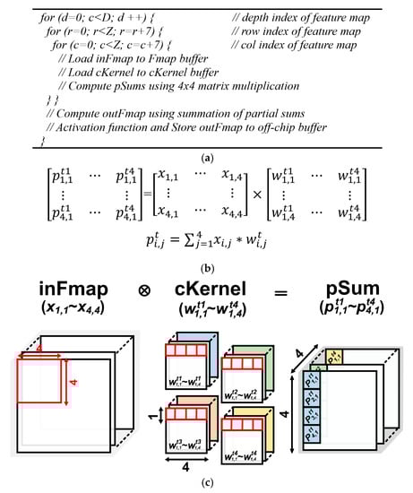 Figure 7a shows a pseudo code of the convolution operation in CENNA. First, it loads the feature map and the convolution kernel into buffers (fMap, cKernel). While loading data, the feature map and the convolution kernel are stored in a 7 × 7 size and in four types of convolution kernls in a 4 × 1 size in buffers. In CENNA, the kernel window moves along the 7 × 7 input feature map stored in the buffer. We will discuss the loading process detail in Section 3.4. Second, once data are loaded, matrix multiplication of a 4 × 4 size is performed. In the matrix multiplication between a feature map and a convolution kernel, the result of the matrix multiplication is a partial sum of the output feature map. Third, partial sums are combined to achieve an output feature map. Next, it is stored in the off-chip memory (External Memory) via the activation function.
