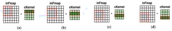 After matrix multiplication of the input feature map of 4 × 4 (x1,1–x4,4) and the component of the first row of the convolution kernels (wt1,1–wt1,4), the input feature map when the kernel window is moved down by one row (x2,1–x5,4) is multiplied by values corresponding to the second row of the convolution kernels (wt2,1–wt2,4). Similarly, the remaining partial sums are calculated in the same way, as shown in Figure 8. Finally, all partial sums are combined to generate output feature maps.