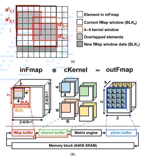 In the convolution layer, adjacent kernel windows have many overlapped elements. As shown in Figure 9a, two 4 × 4 size adjacent kernel windows (at1,1 and at2,1) have 12 overlapped elements in the feature map. Notably, most overlapped elements can be reused for the next kernel window if we reorganize overlapped elements to be adjacent. As shown in Figure 9b, a 7 × 7 tiled block of an input feature map (BLK0) is stored in the fMap buffer, and four types of 4 × 4 tiled convolution kernels are stored in the cKernel buffer. Next, a 4 × 4 kernel window in the fMap buffer moves across the current fMap window (BLK0) and generates partial sums, which will be stored in the pSum buffer. Through DT, the overlapped elements between adjacent 4×4 kernel windows can be reused when generating an output feature map (at1,1, at2,1 and dt3,1, dt4,1) as depicted in Figure 9b. In addition, for a new 7 × 7 tiled block of an input feature map (BLK1) operation, only the newly needed data are loaded.