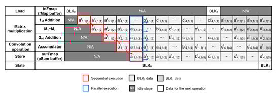 Figure 10 shows the pipelined execution flow in CENNA. The entire pipeline consists of four stages-Load, Matrix Multiplication, Convolution Operation, and Store stages. As explained in Section 3.1, the Matrix Multiplication stage is further divided into 3 stages, which makes the entire pipeline regarded as a 6-stage pipeline. During the Load stage, a 7 × 7 tiled block (e.g., BLK0) of an input feature map is fetched. In the Matrix Multiplication and Convolution Operation stages, CENNA carries out the convolution operation with the loaded 7 × 7 tiled block. The computed results (at1,1(4)) are stored in the pSum buffer during the Store stage. Eventually, after repeatedly processing all the tiled blocks, the final result (at1,1(5)) is obtained through the ReLU operation. It should be noted that when the pipeline is fully filled, five elements in the output feature maps are computed in parallel with only one set of execution units.
