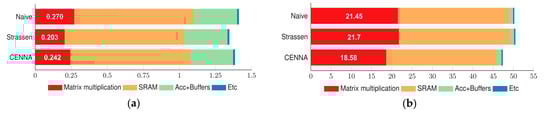 Figure 11 shows the area and power consumption in each accelerator. Area and power consumption mainly incurred by the matrix multiplication are different from one another, whereas the cost of other parts is similar. As shown in Table 4, the Strassen implementation has the smallest silicon area among all compared implementations mainly because the circuit size for matrix multiplication is the smallest, as shown in Figure 11a. Compared to the Strassen implementation, CENNA implementation exhibits a 3% bigger silicon area. However, it consumes the smallest amount of power among all three implementations as shown in Figure 11b. The main reason why CENNA implementation dissipates the least amount of power is that the size of the local buffer is the smallest among all three. As shown in Table 4, the implementation for the Strassen requires more registers than other implementations. Therefore, it is possible to reduce the area by reducing the number of multipliers, but it consumes more power as the use of registers increases.