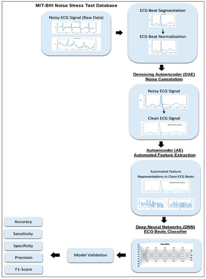 To the best of our knowledge, no research has implemented the DL technique using stacked DAEs and AEs to accomplish feature learning for the noisy signal of ECG heartbeat classification. This paper proposes a combination DAEs–AEs–DNNs processing method to calculate appropriate features from ECG raw data to address automated classification. This technique consists of beat segmentation, noise cancelation with DAEs, feature extraction with AEs, and heartbeat classification with DNNs. The validation and evaluation of classifiers are based on the performance metrics of accuracy, sensitivity, specificity, precision, and F1-score. The rest of this paper is organized as follows. In Section 2, we explain the materials and the proposed method. In Section 3, we conduct an experiment on a public dataset and compare the proposed method with existing research. Finally, we conclude the paper and discuss future work in Section 4.