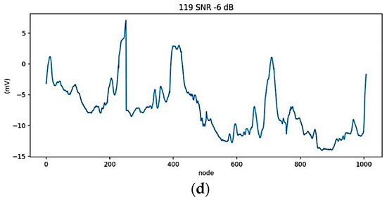 Electrocardiogram (ECG) raw data with noise. (a) Record 118 (24 dB), (b) Record 118 (−6 dB), (c) Record 119 (24 dB), (d) Record 119 (−6 dB).