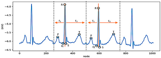 In our previous work [30], ECG signal segmentation was used to find the R-peak position. After the R-peak position was detected, sampling was performed at approximately 0.7-s segments for a single beat. The section was divided into two intervals: t1 of 0.25 s before the R-peak position and t2 of 0.45 s after the R-peak position. The ECG records of 118 24 dB, 118 −6 dB, 119 24 dB, and 119 −6 dB were segmented into the beat (see Figure 3).