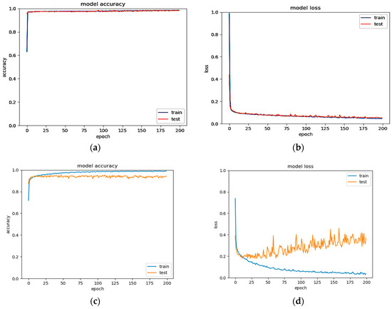 DL performance based on accuracy and loss curves. (a) Accuracy curve (DAEs–AEs–DNNs), (b) Loss curve (DAEs–AEs–DNNs), (c) Accuracy curve (DAEs–DNNs), (d) Loss curve (DAEs–DNNs).