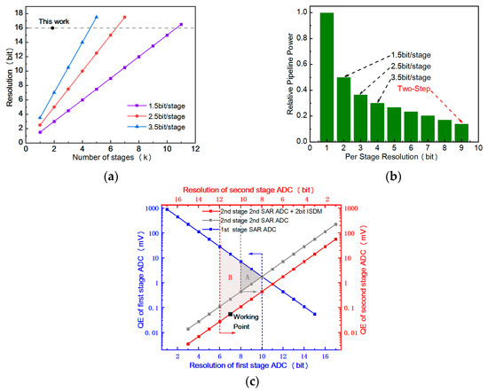 (a) Resolution versus the number of pipelined stages. (b) Relative power versus per stage resolution of ADC. (c) Quantization error (QE) of two-step pipelined-successive approximation register analog-to-digital converter (SAR ADC) versus the resolution of first-stage and second-stage SAR ADC w/ or w/o incremental sigma-delta modulator (ISDM) assisted under the Matlab modeling.