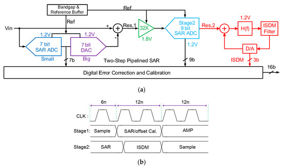 (a) The architecture of proposed two-step pipelined-SAR ADC with ISDM assisted. (b) The timing distribution of the whole pipelined SAR ADC.