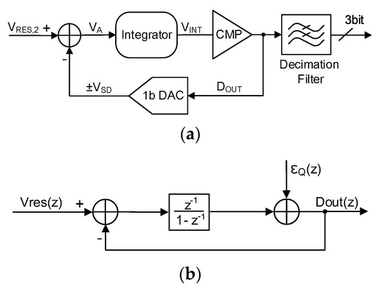 Figure 3a shows the block diagram of ISDM in the second stage. VA is different between VRES,2 and VSD, where VRES,2 and VSD stand for the quantization error of the 2nd stage SAR ADC and reference voltage for 1 bit DAC of the ISDM respectively. In this design, the VSD equaled 2 LSBs of SAR ADC so that the VRES,2 could be within the quantization range of ISDM, considering the noise existed on the top-plate of DAC practically. VINT is the output of Integrator after VA integrated by the continuous-time integrator eight times. Besides, the open-loop integrator has been used in this paper to save power as much as possible comparing to the traditional close-loop and power-hungry integrator [17].