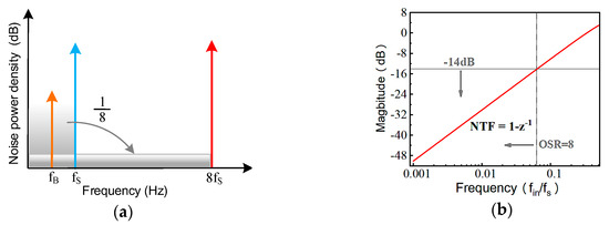 where εQ is first-order shaped by the noise transfer function (NTF): 1 − z−1, with the input VRES,2 passes through a delay z−1 only [18]. In this paper, the VRES,2 was integrated in eight times while it kept in no change, which was similar to the case that the VRES,2 was integrated in only one time by a sampling frequency of 8∙fs and kept the Nyquist signal bandwidth (fB) at the same time (see the illustration in the Figure 4a), and it means the OSR was 8. Therefore, the noise power caused by εQ was shifted beyond fB significantly, and then the noise would be low-pass filtered by the FIR mean filter. Figure 4b shows the bode-diagram of the NTF. Due to an OSR of eight times, the SNR of 2nd stage ISDM-SAR ADC would be improved more than 12 dB within eight times continuous-time integrating options (with one-bit over-range) in theory.