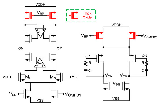 In this design, the two-stage GainBoost OTA was used as the inter-stage amplifier. As is shown in Figure 5, the first stage is a conventional telescope GainBoost structure [20]. In order to decrease the power as much as possible, the 1st and 2nd stages of SAR ADC use low voltage (1.05 V and 150 mV) as the reference voltage whereas the traditional GainBoost OTA needs at least 1.8 V supply voltage, which means the output common mode voltage of GainBoost needs to meet the demands of the input common mode voltage of the 2nd SAR ADC. To remedy this problem, the common-source amplifier with positive channel Metal Oxide Semiconductor (PMOS) input pair was used as the second stage of GainBoost OTA. In this way the output common could be set to 600 mV stably with the switch-capacitor common feedback. Besides, the thick oxide PMOS was used near the high supply voltage (VDDH), which decreases the parasitic capacitance and power considerably [21].