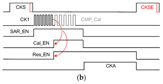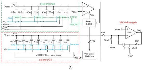 The structure of first stage SAR ADC is shown in Figure 6a. It mainly consists of DACs, sampling switches, comparator and control logic. As illustrated in Section 2.1, the first stage SAR ADC has two parts of small and big DAC arrays. The unit capacitances of them (C1S and C1B) are 4.86 fF and 29.14 fF respectively, with a ratio of 1:6 between them. Those two DACs sample the input signal by the same bootstrap circuit whereas the switching transistors for each bottom plate of capacitor keep in different size to get the similar RC constant. The timing of the whole ADC is shown in Figure 6b. After the sampling phase (CKS = 6 ns, CKSE is the early shutdown clock), the SAR conversions will be carried out within seven cycles, which is generated by asynchronous self-time clock logic within the enable clock (SAR_EN). Once the LSB of 1st SAR ADC ends, 7 bit binary code from register will control the reference voltage to settle the final residue for big DAC with VCM-based switching algorithm [23]. In this design, two kinds of common-mode voltage were utilized, including VCMS (600 mV) for small DAC and VCMA (750 mV) for the top plate of big DAC, which could match the input common-voltage of amplifier.