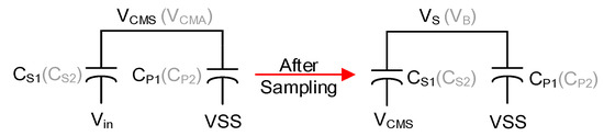 Figure 7 illustrates the sampling networks model of the 1st stage DAC arrays in Figure 6a. According to the charge conservation, the signal on the top plate of DAC after sampling can be expressed by: