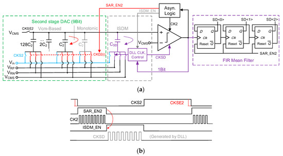(a) The diagram of the 2nd stage ISDM SAR ADC (actually implementation is fully differential. (b) The operation sequence of it.