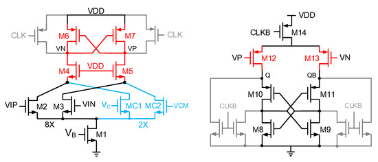 Schematic of the comparator in the 1st stage is shown in Figure 9, and it consists of a pre-amplifier stage and a dynamic latch stage [25]. In this paper, the total sampling capacitance of small DAC was about 622 fF, which indicates the parasitic capacitance (CP1) result in the attenuation on the sampled signal. In order to decrease the influence of parasitic from input-pair devices as much as possible, the sizes of M2 and M3 need to be optimized carefully whereas it also had to balance the tradeoff between the performances of the resolving time, noise and offset. In this design, the M4 and M5 were cascaded upon the drain of M2 and M3 respectively while the gates of M6 and M7 were connected in a cross-coupled way, which could increase the impedance of VP and VN properly and decline kick-back noise from dynamic latch either. The dynamic latch stage adopted PMOS as an input-pair instead of connecting the input to the cross-coupled nodes of latch directly, which helped reduce kick-back noise to the top plate of DAC further [26].