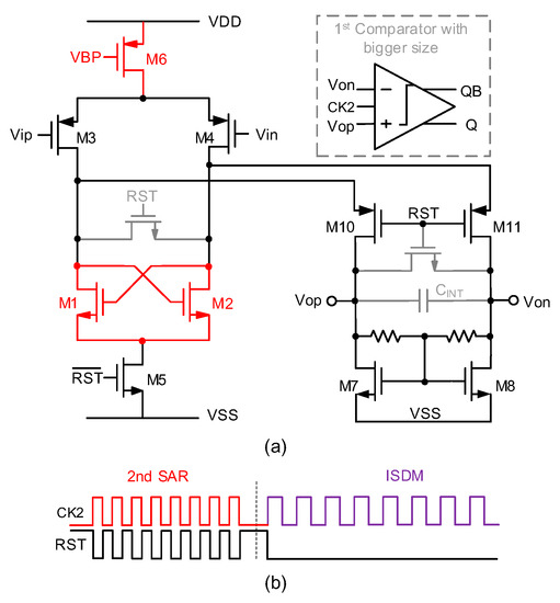 The comparator used in the 2nd SAR ADC is shown in Figure 10a, which includes an integrator stage and a comparator with the same structure of that in the 1st SAR ADC, whereas the sizes of input-pair were bigger than that in the 1st comparator to meet the higher resolution (9-bit) demands of the 2nd SAR ADC. In this design, the PMOS differential pairs (M3 and M4) were used to decrease the input-referred noise during the integrating phase as much as possible while the NMOS M1 and M2 were connected in a cross-coupled way to get well gain income. The trail current of differential pairs was determined by current source M6. It can provide a stable DC current, then the gain of integrator () can be set in a near constant state with a small input signal (within 5 mV) during the ISDM process, which can be expressed by: