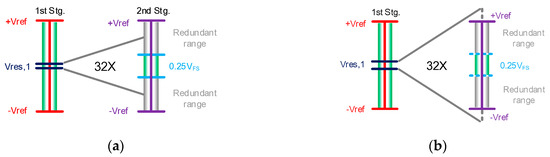 The key point to keep the system stabilization of pipelined-SAR ADC includes two aspects. The first one is to make sure the amplified residue from the 1st stage SAR ADC is within the quantization range of the 2nd stage ADC (see the explanation in Figure 11a). The second is to ensure the linearity and resolution of inter-stage amplifier meets the demands of 2nd stage ADC. As is depicted in Section 3.1, the amplifier was designed to satisfy design requirements with 75 dB SNDR and 84 dB SFDR respectively, leaving the first point to be resolved. After the conversion of the 1st stage ADC, the residue (Vres,1) can be expressed: