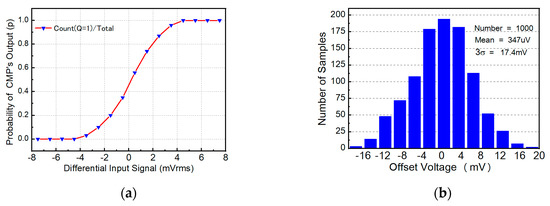 In order to estimate the input-referred noise and offset voltage of comparator located in 1st stage ADC, the methods proposed in [27] adopted to calculate the Vn,cmp and the result is shown in Figure 12a. With 16 equally spaced input signals from −LSB1 to +LSB1, the fitting curve shows the standard deviation (σn,cmp) of Vn,cmp was near 1.4 mV (0.1LSB1, the LSB of the 1st stage). Due to the randomness of Vn,cmp, it can only be tolerated by inter-stage redundant. Meanwhile the Monte Carlo simulation was carried out by 1000 times to evaluate the Voffset,cmp and the results as shown in Figure 12b. The root mean square value of the offset voltage was 347 μV whereas its 3σ was 17.4 mV, which exceeded 1LSB1 (14 mV). Therefore, the input-referred offset would affect the resolution of 1st stage directly if the mismatch of devices was considerable. In this paper, the scheme for the calibration of comparator is shown in Figure 13. It was similar to [28], whereas the calibration reference voltage gained was quietly different. The resistance string was chosen rather than calibration capacitor unit because it is hardly ever possible to make sure the charge and discharge time is equal, which probably leads to the accumulation of charge on the calibrating capacitor and then a big shift of the common voltage of calibration transistor may influence the calibrating resolution in practice.