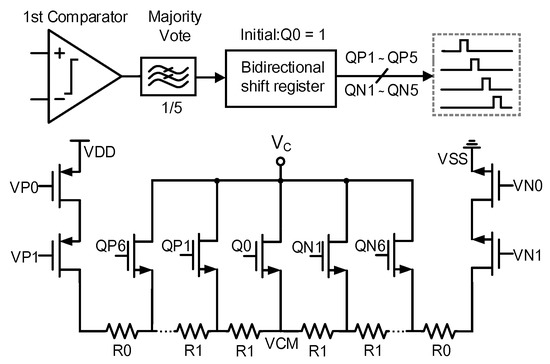 After the conversion of the LSB in the 1st stage, the top plate of small DAC array would be shorted to VCMS while the gates of the calibration transistor MC1 and MC2 were connected to VCM generated by resistance string, which was biased by the current source to isolate noise from the supply voltage as much as possible. The size of MC1 and MC2 is a forth of input-pair M2 and M3, which can relax the resolution demand of resistance string and decrease the kick-back noise properly. Then the calibration process will begin within five asynchronous cycles (see the illustration in Figure 8b). As is illustrated in Figure 13, the output of the majority voting block will control the bidirectional shift register to generate the calibration control signal (QN1-N6 for positive offset voltage and Q0 for initial voltage with QP1-P6 for negative offset voltage). In order to cover at least 2σ (12 mV) offset, the resistance string had 12 stairs to generate relative reference voltages with a near 4.7 mV (because 4× gain was put between input pair and calibration transistors as shown in Figure 9) step between them.