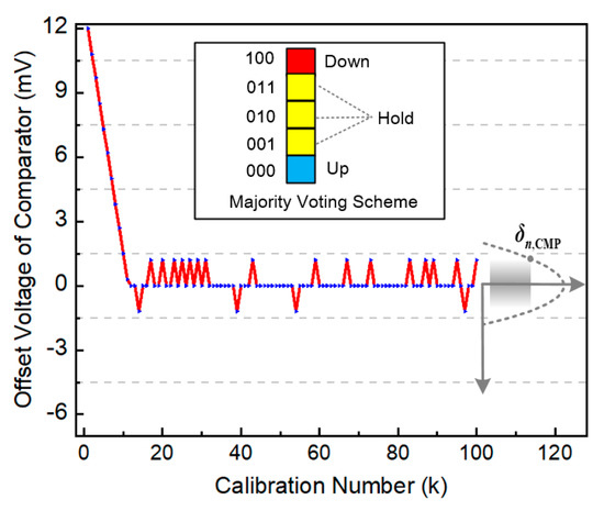 The convergence curve of input-referred offset voltage (Voffset,cmp) of the 1st comparator and the majority voting scheme.