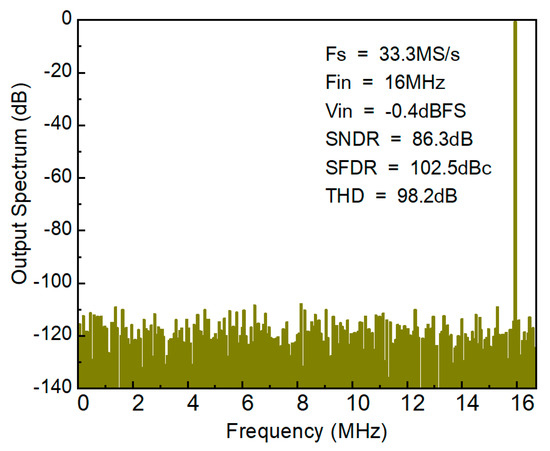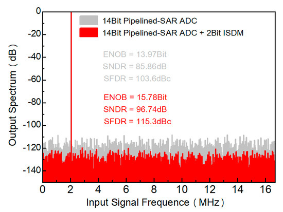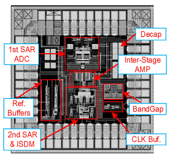 Figure 17 shows the layout photography of the proposed 16-bit pipelined-SAR ADC with ISDM assisted, which mainly consists of the 1st and 2nd stage SAR ADC and inter-stage amplifier, band gap, input and reference buffer with a core area of 0.202 mm2. The post-layout simulation results of SNDR versus Monte Carlo (MC) are shown in Figure 18. With a 2.3 MHz input signal, the SNDR was around 86.3 dB. Comparing to the pre-layout simulation results, the SNDR dropped nearby to 10.4 dB, which was mainly caused by added transient noise and mismatch. Other reasons like the interconnected parasitic capacitor and inductance of the I/O port as well as supply ripples (1%, an extreme case) could also lead to the drop of the performance. Figure 19 shows representative FFT spectra taken at a 16 MHz and −0.4 dBFS input sinusoid signal under post-layout simulation with transient noise added to verify the design and compare with other works. The proposed ADC could achieve a high performance with an ENOB exceed 14-bit. Meanwhile, the SNDR and SFDR were more than 86 dB and 102 dBc respectively with THD near 98.2 dB. Anyway, the post-layout simulation had shown a properly superior performance comparing to some recent Nyquist ADCs as indicted in Table 2. Compared with a high-resolution pipelined ADC [30] and a high resolution SAR ADC [31], this work had a significant advantage of higher SNDR and SFDR due to the hybrid architecture of pipelined-SAR ADC with ISDM assisted. Besides, this kind of architecture could achieve a more power-efficiency merit compared to conventional pipeline ADC in high-precision field [32]. However, the total power consumption could be further modified because of the usage of GainBoost OTA in this work compared to [30] with a low power Ring AMP used.