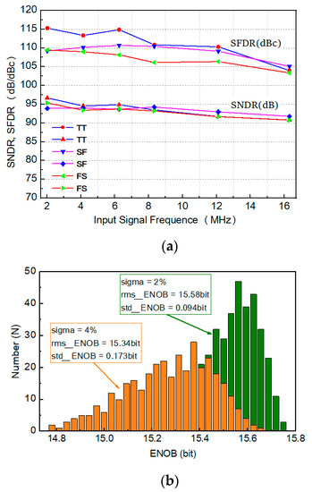 The prototype 16-bit two-step pipelined-SAR ADC was implemented in the 40 nm CMOS process and it operated at 33.3 MS/s under 1.2 V/1.8 V supply with the total power of 19.2 mW, including the on-chip background calibration. Figure 15 shows pre-layout simulation results about SNDR and SFDR with a 2.3 MHz input signal. Comparing to the conventional 14 bit pipelined-SAR ADC, the proposed 16 bit hybrid two-step pipelined SAR ADC with ISDM assisted could achieve an SNDR of 96.74 dB and SFDR of 115.30 dBc respectively, with a remarkable improvement of SNDR near 12 dB. Figure 16a shows the simulated SNDR and SFDR versus input signal frequency from low frequency to Nyquist with different process corners (TT, SF and FS). SNDR was better than 91 dB in the first Nyquist zone with the SFDR beyond 103 dBc. Therefore, this kind of design shows remarkable robust characteristics to the process variation. The effective number of bits (ENOB) distribution of ADC versus the number of Monte-Carlo run with capacitor mismatch is shown in Figure 16b, comparing with 4% of the capacitor mismatch added on DAC arrays, 2% of mismatch caused only about a 0.2-bit ENOB drop, which was due to the relatively enough redundant bits between the 1st and 2nd stage of ADC, hence the demand of capacitor mismatch capacitors could be relaxed.