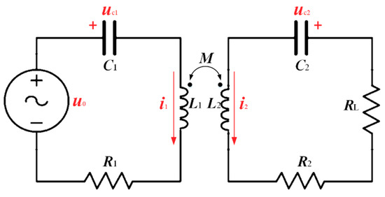 The MCR-WPT system has four basic circuit topologies including series–series, series–parallel, parallel–series, and parallel–parallel topologies [23,24]. Regardless of circuit topologies, the transmitter and receiver should be in resonance to make the system work. Different circuit topologies have been widely studied, and experiments [25,26,27] show that the expression of resonance frequencies of the series–series topology is the simplest compared with other circuit topologies; thus, that it is convenient to introduce the non-linear dynamics theory. The MCR-WPT system with the series–series topology was studied, and the equivalent circuit model with typical RLC series circuits on both sides is shown in Figure 1. Based on Kirchhoff’s Law, the differential equations of the MCR-WPT system were obtained as follows: