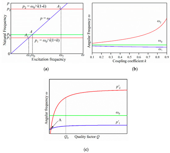 The resonance angular frequencies of the system vary with the coupling coefficient k shown in Figure 2b, and three curves correspond to points A1, A2, and A shown in Figure 2a. We can find that the frequency splitting phenomenon of the system becomes gradually more obvious with the increase of the coupling coefficient k based on Figure 2b. Because k ≠ 0, the frequency splitting phenomenon always occurs within the theory analysis.