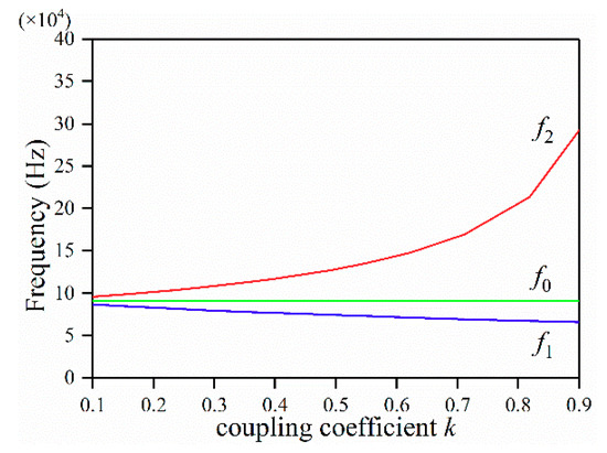 In order to check the validation of the proposed model mentioned above, the natural frequencies of the experimental system of Reference [22] were calculated based on Equation (5). The experimental parameters are shown in Table 1. We used the calculated data shown in Table 2 to describe the relationship between the coupling coefficient k and natural frequencies, and the results are shown in Figure 3. Comparing the calculated results shown in Figure 3 with the experimental results shown in Figure 4 and Figure 5 from Reference [22], the good consistency between both results verifies the validity of the proposed model of the MCR-WPT system.