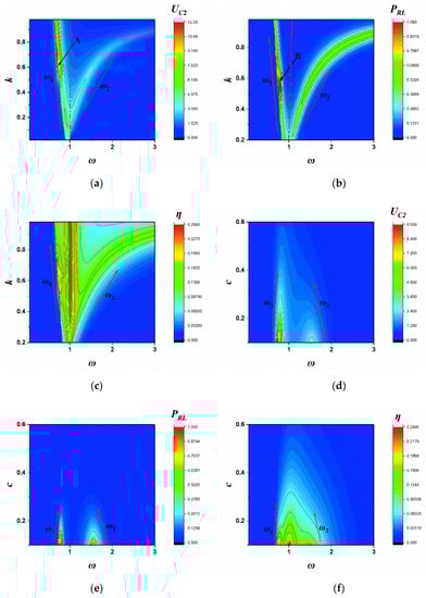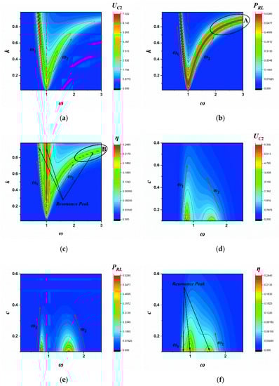 In Figure 5b,e, the transmission power also had a jump phenomenon when the excitation frequency increased from a lower frequency to ω1. In Figure 5b, when k was near 0.5, the jump phenomenon of the transmission power was the most significant. In Figure 5e, the jump phenomenon of the transmission power gradually weakened as c increased. Consistent with the jump phenomenon of the transmission power, the transmission efficiency had a jump phenomenon in the vicinity of ω1 shown in Figure 5c. When k was near 0.5, the jump phenomenon of the transmission efficiency was also significant.