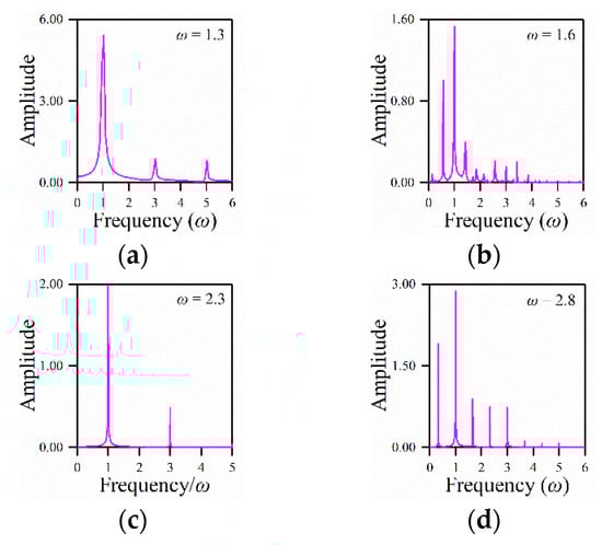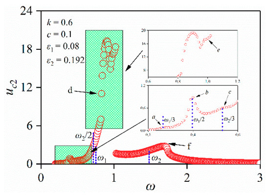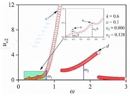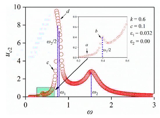 In order to further study the jump phenomena of the system, the resonance response of uc2 was obtained and is shown in Figure 9. In Figure 9, the maximum amplitude of uc2 varied suddenly at ω1 and ω2. When the excitation frequency decreased from a higher frequency to the vicinities of ω2 and ω1, the maximum amplitude increased suddenly. The resonance peaks of ω1 and ω2 were inclined to the right, showing a hard spring characteristic. In the vicinities of ω1/3 and ω2/3, the vibration existed as third-order superharmonic resonances. In order to better analyze output response components, the FFT spectra at different excitation frequencies are shown in Figure 10. When the excitation frequency was at point a in the vicinity of ω1/3, as shown in Figure 9, the superharmonic frequency 3ω was the largest and other output responses w smaller as shown in Figure 10a. It is pointed out that the superharmonic frequency 3ω was related to the superharmonic resonance of ω1. If the excitation frequency was at point b in the vicinity of ω2/3, as shown in Figure 9, the output response was composed of the harmonic frequency ω and the superharmonic frequency 3ω, as shown in Figure 10b, while the others were small enough to be ignored. The superharmonic frequency 3ω was related to the superharmonic resonance of ω2. If the excitation frequency was in the vicinities of points c and d, as shown in Figure 9, the harmonic frequency ω was the main component, as shown in Figure 10c,d, and the superharmonic frequency 3ω was smaller. Comparing the spectral characteristics of the non-linear system with ε1, the non-linear system with ε2 had a significant component of the superharmonic frequency 3ω in the output response. Under the condition of certain coupling coefficients, the harmonic frequency ω was superimposed with the superharmonic frequency 3ω when the excitation frequency was in the vicinity of ω1, and the superharmonic frequency 3ω corresponded to ω2. The frequency superposition can explain why the jump phenomena continued to fluctuate with the increase of k as shown in Figure 8.