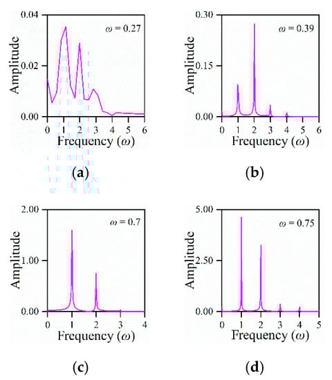 FFT Spectra: (a) ω = 0.27, (b) ω = 0.39, (c) ω = 0. 7, (d) ω = 0.75.