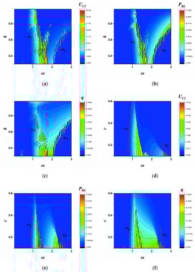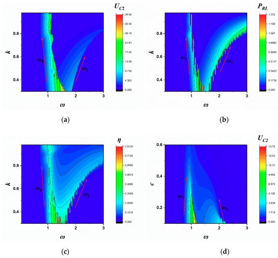 Based on dimensionless decoupled transmission dynamic equations, the Runge–Kutta method was used for the numerical simulations. The results of the numerical simulations show the transmission characteristics of the MCR-WPT system. The horizontal and vertical coordinates denote the excitation angular frequency ω and the key parameter k or c. Contours with color filling represent voltages of capacitors, the transmission power, and the transmission efficiency. The color tends to red which indicates that the value gradually becomes larger, and the color tends to blue which indicates that the value gradually becomes smaller. In order to facilitate the description of the numerical simulations, we made some definitions of changes in the figures. If the color changes to blue on both sides of a certain excitation frequency, the excitation angular frequency corresponds to the resonance angular frequency of the MCR-WPT system. At the resonance angular frequency, the state of transmission characteristics of the system is called the resonance peak. If contours are very dense and there is no transition of color changes, transmission characteristics changed suddenly. Referring to concepts of non-linear dynamics, this phenomenon is called a jump phenomenon. In addition, the dimensionless value of the resonance angular frequency of the RLC series circuit ω0 is 1. Based on the above illustrations, transmission characteristics of the MCR-WPT system will be analyzed through the results of the numerical simulations as follows.