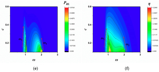 Variations of the transmission power and transmission efficiency are shown in Figure 4b–f. The frequency splitting phenomenon is remarkable in these figures. In Figure 4b, the transmission power of the resonance peaks did not change significantly. In Figure 4e, the transmission powers of resonance peaks at ω1 and ω2 appear to be the same. With increases of the coefficient c, the transmission power decreased gradually, and the attenuation tendencies of the two peaks tended to be consistent. In addition, when c was large, a single peak state appeared, and the frequency splitting phenomenon disappeared. In Figure 4c,f, variations of the transmission efficiency showed a significant three-peak state which corresponded to ω1, ω0, and ω2, respectively. The transmission efficiency gradually appeared as a single peak state, shown in Figure 4f, with increases of the coefficient c.