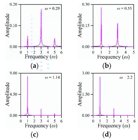 When the excitation frequency increased from a lower frequency to ω1, the maximum amplitude increased suddenly. Under the non-linear parameter ε1, the resonance peak of ω1 tilted to the left; this is called a soft spring characteristic. Second-order superharmonic resonance occurs in the vicinity of ω1/2, and their components are shown in Figure 7b. In addition, the excitation frequency ω2/2 is very close to ω1, and the second-order superharmonic resonance corresponding to ω2 is not obvious. Their components are shown in Figure 7c,d. In Figure 6, the output response at point a has an obvious constant component, and the main components are the harmonic frequency ω and the superharmonic frequency 2ω. When the excitation frequency locates at point a in the vicinity of ω1/2, the superharmonic frequency 2ω is the largest, and the harmonic frequency ω is smaller in output response components. If the excitation frequency is at points c and d in the vicinity of ω1, the output response components are composed of the harmonic frequency ω and the superharmonic frequency 2ω, while other superharmonic frequencies are very small and can be ignored. It is worth noting that the superharmonic frequency 2ω is related to the superharmonic resonance of ω2. Because k has a great influence on ω2, ω2/2 varies greatly with changes of k. When ω2/2 is close to ω1, the frequency components ω and 2ω are superimposed which can explain why the jump phenomena continue to fluctuate with the increase of k shown in Figure 5.