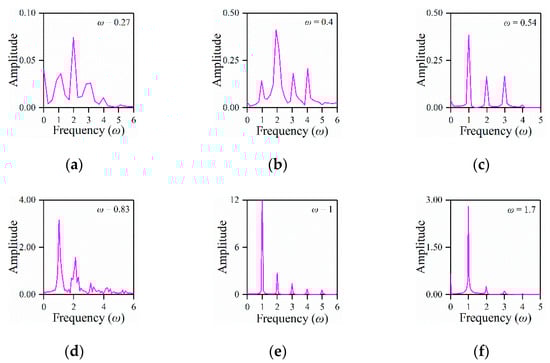 In Figure 11, the resonance peaks of ω1 and ω2 are tilted to the right, shown as a hard spring characteristic. There are two jump phenomena at points d and e in the vicinity of ω1 as shown in Figure 11. When the excitation frequency was low, the third-order superharmonic resonance and the second-order superharmonic resonance appear at points a, b, and c as shown in Figure 11. The two third-order superharmonic resonances corresponded to ω1 and ω2, respectively. The second-order superharmonic resonance corresponded to ω1. The excitation frequency ω2/2 was very close to ω1, and the harmonic frequency ω was superimposed with the superharmonic frequency 2ω when the excitation frequency was in the vicinity of ω1. In order to better analyze the components of the output responses, the FFT spectra at different excitation frequencies are shown in Figure 12. The output response had great significant superharmonic components. In addition, a larger constant component appeared at point a. The components of the output responses were mainly composed of the harmonic frequency ω, and the superharmonic frequencies were small at points e and f. Because ω2 was very sensitive to the coupling coefficient k, the frequency superposition occurred in the vicinity of ω1 which made the output response unstable.