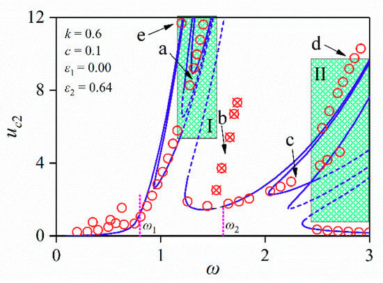The theoretical solution curves shown in Figure 14 can better reflect the spectrum analysis results. In the vicinities of points a and c, the numerical solutions are approximately coincident with the theoretical solutions. In the vicinity of point b shown in Figure 14, there are unstable theoretical solutions. In the vicinity of point d, the continuous numerical solutions deviate gradually upwards from the stable theoretical solution curves as the excitation frequency increases. The harmonic frequency ω was the major component of the theoretical solution, but the results of the numerical simulation show that there were different superharmonic or subharmonic frequencies. Therefore, the numerical solutions are relatively consistent with the theoretical solutions. In Figure 14, the theoretical solution curves present complex multi-solution phenomena in the green shadow regions I and II.