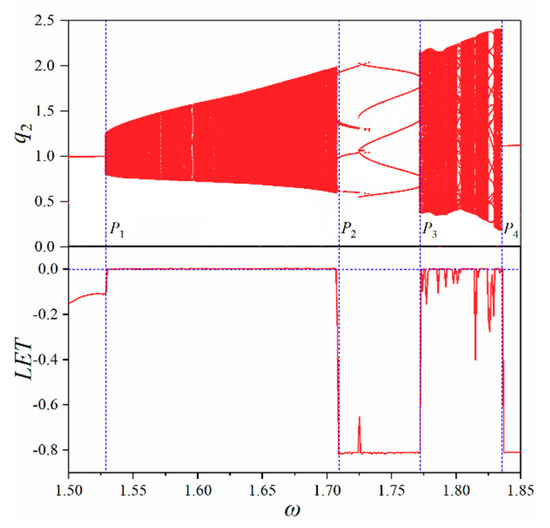 At point a, the output response was dominated by the harmonic frequency ω, and there were smaller superharmonic frequencies 3ω and 5ω. At point b, frequency components of the output response were composed of various superharmonic frequencies and subharmonic frequencies. In order to determine whether output responses are chaotic, the bifurcation map and the largest Lyapunov exponents were calculated as shown in Figure 16. In the vicinity of point b, Figure 16 shows that the largest Lyapunov exponents were always no more than zero, and the system appears to have complex non-linear phenomena such as almost periodic signals of blocks of P1P2 and P3P4 and multi-periodic signals of the block P2P3 rather than the chaos phenomenon. At point c, the output response was dominated by the harmonic frequency ω, and there was a smaller superharmonic frequency 3ω. The FFT spectra of point d is clearer than that of point b shown in Figure 15, the system appears to have multi-periodic signals.