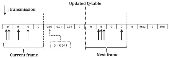 Figure 1 shows the calculation process of consequences of transmission in environment assumed that four agents in IoT networks transmit data in a frame comprising of four slots when , . The frame is a row vector with 1 by the number of slots. In the current frame, two agents select 1st slot for data transmission and the transmission result (−0.02) is stored in 1st slot. The next frame is reset to zero after the Q-table is updated. For the next slot, three agents select 2nd slot but the agents can only know whether there was collision or not. In practice, since agents cannot perfectly estimate the number of collided agents, every agent in this system regards this 2nd slot as doubled negative rewards due to the collision. Then, can be calculated as Equation (4), where is the reward of agent m chooses action a at time t.