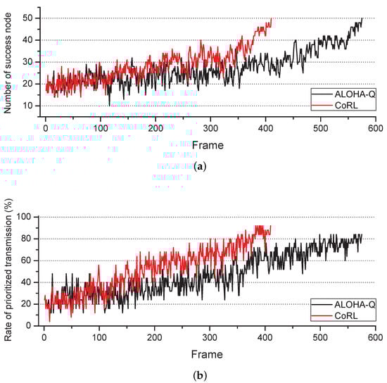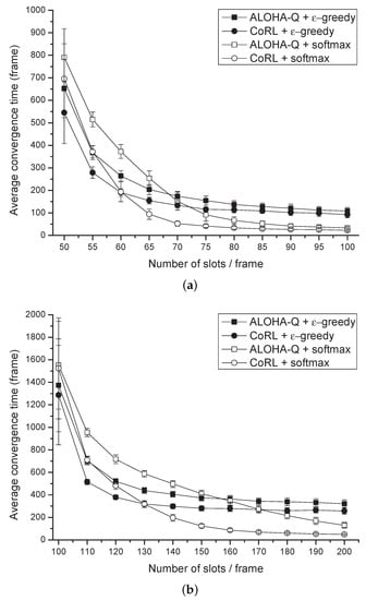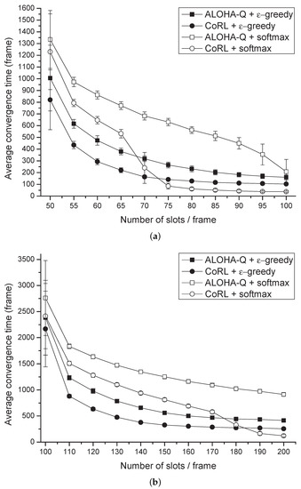 Figure 3 shows the average convergence time with respect to the number of slots in a frame for the deprioritized services. Each marker represents the convergence time averaged for 100 simulations with varying number of slots per frame. The average convergence time has been determined by the number of nodes approaching the steady-state in the networks. Here, the value of and is proportional to , where f is the number of frames spent. As shown in the Figure 3, the average convergence time decreases with increasing number of slots per frame, because when the number of slots increases, possible choices for the node also enlarge. In Figure 3a, the number of frames for convergence of the proposed CoRL has been spent about 228 frames less than that of the ALOHA-Q and as shown in Figure 3b, proposed scheme have reduced 374 frames compared with ALOHA-Q. For both results, when the number of slots per frame is small CoRL with -greedy policy control was the fastest model compared with other models. However, as the number of slots per frame increases, CoRL with softmax policy control showed better performance compared with other models.