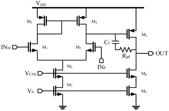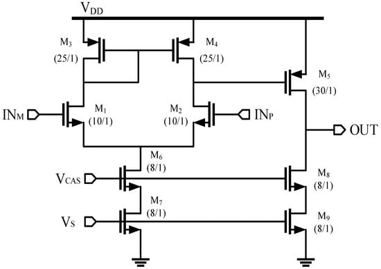 The OTA in the bandgap voltage reference is presented in Figure 6. The reference voltage (VREF) of 880 mV was selected to have 1 V as the output voltage. The resistors RF1 and RF2 determine the output voltage, 1 V, based on the ratio of those resistors and the reference voltage from the bandgap reference. The equation for the output voltage (Voutput) can be expressed as