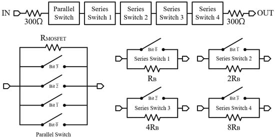 For the resistive bank (Rbank) presented in Figure 2, it is implemented to cover the range of resistance from 750 Ω to 1125 Ω in the typical process condition. Considering the process variation of the polyresistor and the active device, the designed resistive bank was designed to provide the correct summing gain over the possible process variation. Figure 4 presents the schematic diagram of the proposed resistive bank. The aimed resistance of the resistor bank is 950 Ω. The parallel switch and the series switches use the bits 0, 1, 2, and 3. The 15 resistors, RB, are added to provide a 25 Ω step from 750 Ω to 1125 Ω. The parallel switches make the entire resistance fixed so that only the number of RB determines the total resistance. The equation for the resistor bank is given by