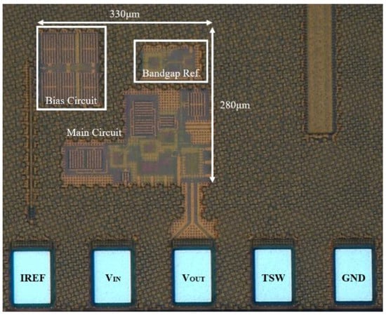 Figure 7 shows a microphotograph of the implemented LDO regulator with a chip size of 0.092 mm2 without pads, while Figure 8 is the power supply rejection ratio (PSRR) and regulation measurement setup. Rpar is the parasitic resistance in the measurement setup. An SPI (Serial Peripheral Interface) module is used to control the resistor bank and the biasing points of each OTA. The quiescent current consumption of the circuit is 0.385 mA under a 1.2 V supply voltage.
