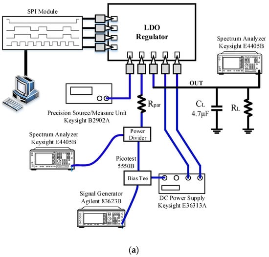 (a) Power supply rejection ratio (PSRR) and (b) regulation measurement setup of the proposed LDO regulator.