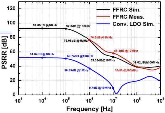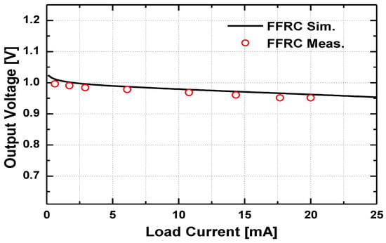 In Figure 9, the PSRR comparison graph between the simulation and measurement of the proposed LDO regulator and a conventional LDO regulator is shown. Measurements and simulation correspond well when we include the parasitic series resistance Rpar in the VDD input port as presented in Figure 8. Compared with a conventional LDO regulator, 30–40 dB of extra PSRR were observed from 10 kHz–10 MHz. Figure 10 shows the output voltage when the load changes. Load regulation can be calculated by Equation (3).