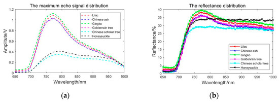 We employed two features extracted from a spectrally resolved echo waveform, which can record the target reflected powers in a series of continuous channels, namely echo maximum and reflectance. Echo maximum is the amplitude peaks extracted from echo intensity waveforms. LiDAR intensity data have been proven beneficial in data registration, feature extraction, classification, segmentation, and object detection [29]. However, intensity is always influenced by some intrinsic and extrinsic factors. The extrinsic factors of different scanning operations are variable. To overcome this issue, calibration is adopted to correct the recorded intensity values to produce reflectance values that are more useful and more closely related to true surface characteristics. The reflectance is the calibrated echo intensity, which is a prerequisite for many quantitative applications, and it has become an important research topic recently [20,21,22,23,24]. In this paper, we conducted LiDAR calibration assisted with a white reflectance standard board with 70% reflectivity [19,24,27]. Figure 2 shows the spectral profiles of the echo intensity and reflectance maximum from six different samples in Dataset 4.